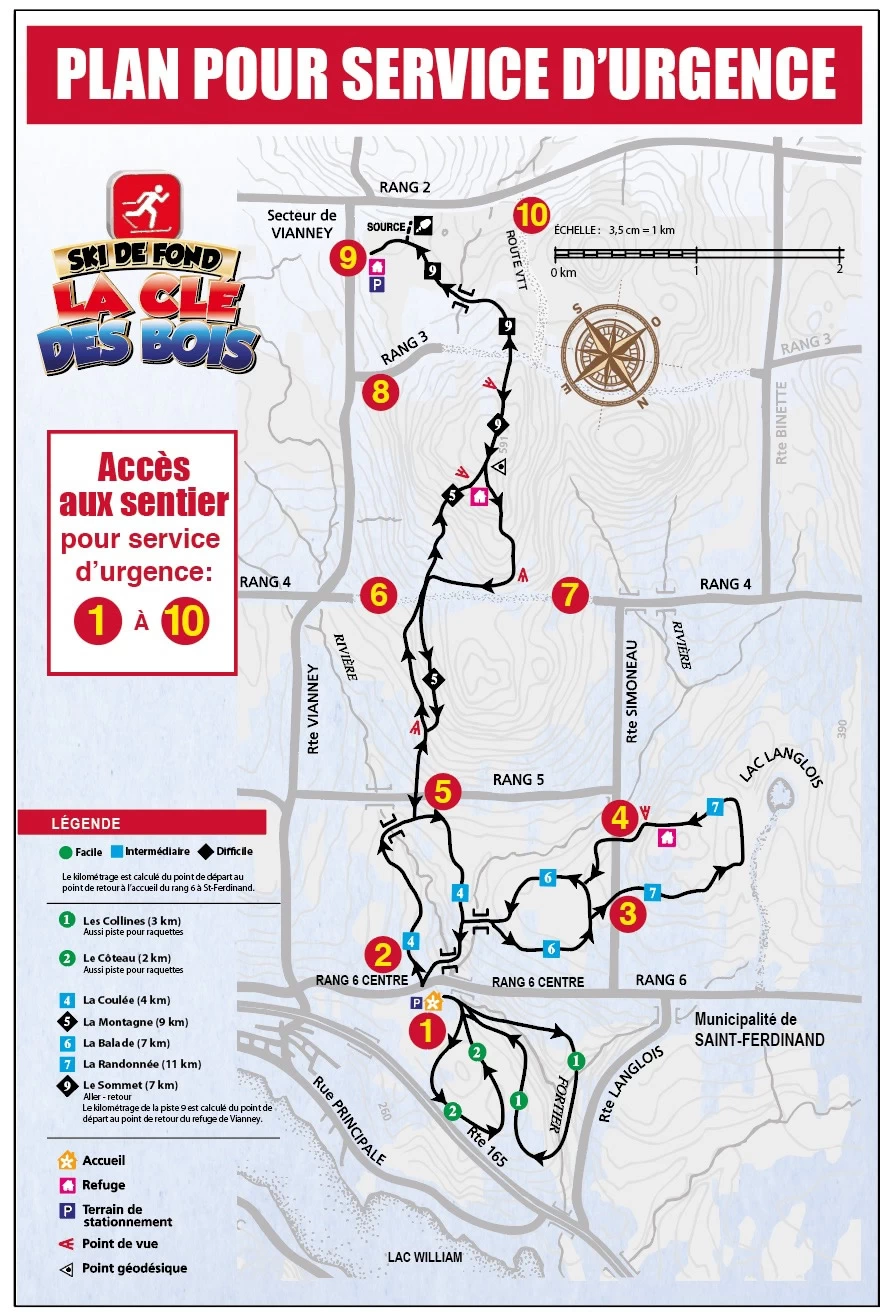 Fermeture officielle ce 8 mars 2026 pour la saison 2025-26. Au plaisir de vous revoir sur nos pistes l'an prochain. À propos du Centre de Ski Il y a trente ans, quelques adeptes de ski et amants de la nature ont vu les immenses possibilités du ski de randonnée dans la région. De quelques kilomètres au début, les pistes se sont étalées progressivement pour constituer un réseau complet de 30 kilomètres. Un attrait majeur du centre du ski est la liaison Saint-Ferdinand avec le secteur Vianney. En effet du chalet d'accueil de Saint-Ferdinand, on peut rejoindre le village de l'ex-Vianney, distant de 9 kilomètres, un aller-retour mémorable pour les skieurs. Autour de cet axe gravitent plusieurs pistes variées et intéressantes s'adressant à tous les niveaux de skieurs et groupes familiaux. De la forêt de conifères à l'érablière typique des Bois-Francs, du sommet le plus élevé à près de 2 000 pieds jusqu'à proximité du lac William, le skieur est choyé par tant de diversité et les points de vue qui s'offrent à lui récompensent largement ses efforts. Nous vous recommandons d'apporter dans votre havresac: Nourriture et breuvage pour le parcours. Trousse de fartage, trousse de réparation (tournevis, ruban adhésif, lacets, couteau, allumettes), petite trousse de premiers soins, spatule d'urgence, carte des pistes, vêtements de rechange. Bienvenue à tous! |